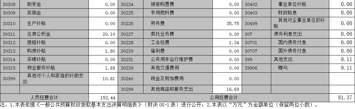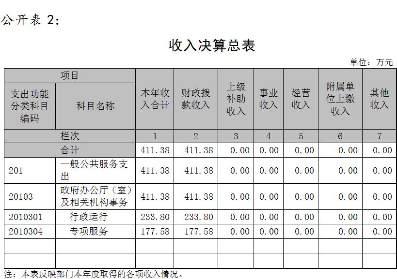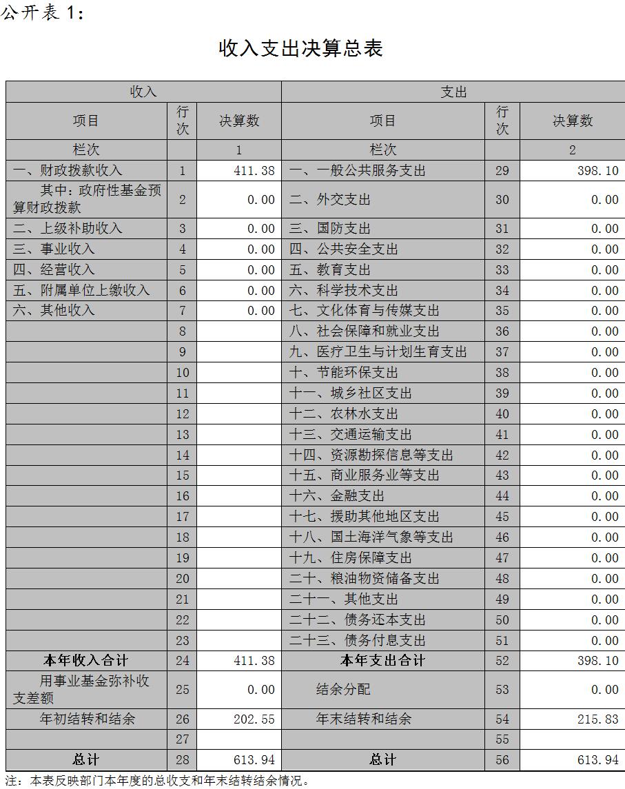2017年決算收入411.38萬元,其中全部為財政撥款收入;2017年決算支出總計398.10萬元,其中全部為一般公共服務支出。