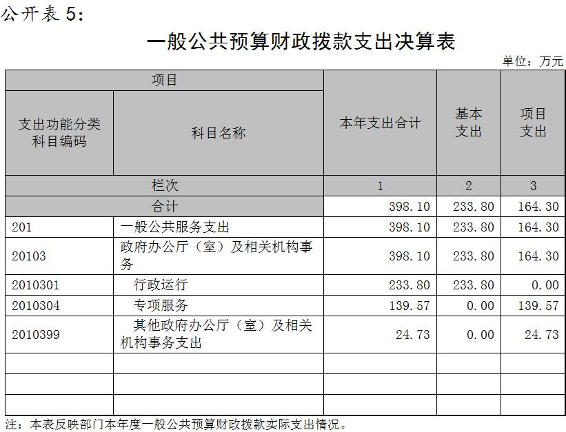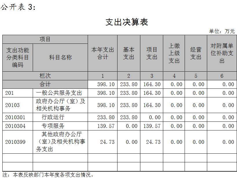 2.全年支出決算數情況:2017年度決算支出398.10萬元,比年初預算數397.21萬元基本持平,執行率100%。比上年決算支