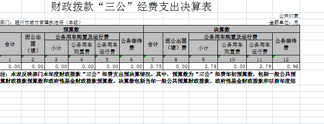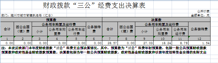 ??2017年城管局(匯總)“三公”經費決算財政資金安排28.57萬元,其中:因公出國(境)預算0萬元,決算0,比上年減少5.6萬元,原因是年來嚴控三公經費的支出特別是出國出境;公務接待費1.54萬元比上年的2.52萬元減少0.98萬元,減幅63.6%,公務接待27批次,來客人數234人次,陪客81人次;公務用車購置費為0,比上年減少了59.83萬元,原因是上年新單位成立9個分局在我局統一購執法車;公務用車運行費8.79萬元,比去年10.34減少了1.55萬元,主要原因是限卡限號加油,合理開支,嚴格執行公車運行開支。