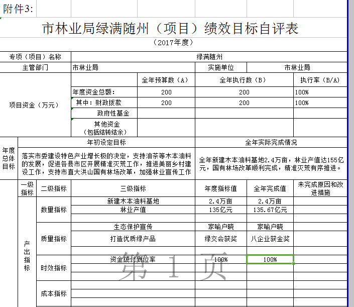 3、200萬元綠滿隨州項目績效自評綜述:項目全年預算數(shù)為200萬元,執(zhí)行數(shù)為200萬元,完成預算數(shù)的100%。主要產出和效果:一是提高企業(yè)和農民發(fā)展木本油料等林業(yè)產業(yè)的積極性;二是增加林農收入。發(fā)現(xiàn)的問題及原因:林業(yè)項目周期長,見效慢。