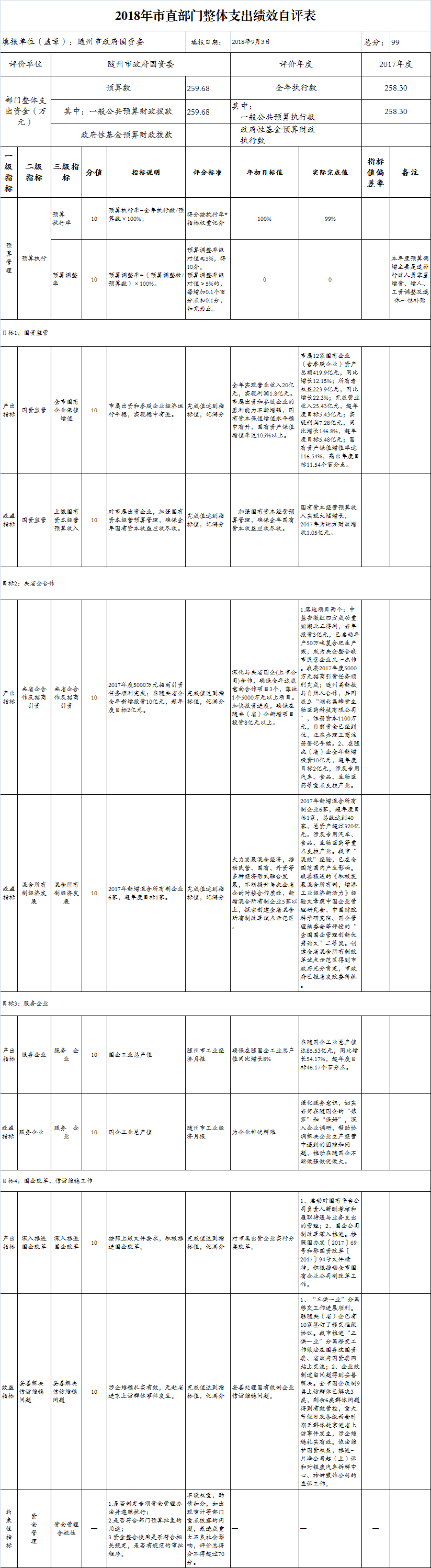 實際完成情況:一是啟動對國有平臺公司負責人薪酬考核和履職待遇與業務支出的管理。目前已組織第一批納入考核的5家平臺公司制定了年度經營目標和任期目標,簽訂了目標責任書,將企業負責人薪酬與企業經營業績直接掛鉤,促進企業健康持續發展。二是國企公司制改革深入推進。按照國辦發〔2017〕69號和鄂國資改革〔2017〕94號文件精神,積極推動全市國有企業公司制改革工作。市公安局所屬兩家企業的脫鉤改制工作正在加快推進。曾都區啟動了區城投的轉企改制,擬實行企業化管理。三是“三供一業”分離移交工作進展順利。四是企業改制遺留問題得到妥善解決。駐隨央(?。┢笠延?0家簽訂了移交框架協議。供電公司、東風車輪廠、煙草公司已完成現場勘測、供水、供電及物業維修改造方案。明確了一家市屬出資企業承接在隨央(?。┢髽I“三供一業”分離移交供水、物業管理并積極推進接管事宜。我市推進“三供一業”分離移交工作做法在國務院國資委、省政府國資委網站上交流。