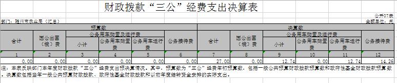 隨州市農(nóng)業(yè)局(本部門)2017年度 “三公”經(jīng)費(fèi)支出決算數(shù)為19.54萬(wàn)元,較上年18.39萬(wàn)元,增加6.25%,比“三公”經(jīng)費(fèi)預(yù)算支出數(shù)27.71萬(wàn)元少支出8.17萬(wàn)元,主要原因是2017年因公出國(guó)(境)未發(fā)生支出。其中:因公出國(guó)(境)0批次0人,支出決算數(shù)為0萬(wàn)元,較上年11.80減少11.80萬(wàn)元,減少100%;公務(wù)接待75批次652人,支出決算數(shù)為6.80萬(wàn)元,較上年1.84增加4.96萬(wàn)元,增加269.56%,原因是2016年部分公務(wù)接待在2017年才結(jié)算;公務(wù)用車運(yùn)行維護(hù)費(fèi)支出決算數(shù)為12.74萬(wàn)元,較上年4.75增加7.99萬(wàn)元,增加168.21%,原因是公車保有量4臺(tái),比上年度增加了3臺(tái)(車改,農(nóng)業(yè)系統(tǒng)依規(guī)保留的公車納入農(nóng)業(yè)局統(tǒng)一管理),相應(yīng)增加了車輛運(yùn)行經(jīng)費(fèi)的支出。