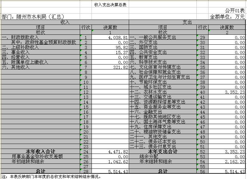 隨州市水利局(匯總)2017年決算收入總計(jì)5514.43萬(wàn)元,其中:財(cái)政撥款收入4038.81萬(wàn)元,上級(jí)補(bǔ)助收入95.82萬(wàn)元,,事業(yè)收入15.37萬(wàn)元,其他收入321.82萬(wàn)元,上年結(jié)轉(zhuǎn)和結(jié)余1042.62萬(wàn)元。其中財(cái)政撥款收入與年初預(yù)算2456.52萬(wàn)元相比增加1582.29萬(wàn)元,增加64.41%,主要是2017年年初預(yù)算時(shí)沒有將上級(jí)專項(xiàng)項(xiàng)目資金納入預(yù)算造成的。