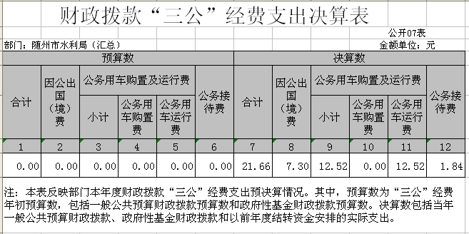 隨州市水利局(匯總)2017年財(cái)政撥款“三公”經(jīng)費(fèi)支出21.66萬(wàn)元,比年初預(yù)算增加0.17萬(wàn)元,增加0.79%,主要原因是:2016年度公車改革時(shí)車輛運(yùn)行維護(hù)經(jīng)費(fèi)2016年底未及時(shí)結(jié)賬一直到2017年年初結(jié)賬造成的。其中:(1)2017年初預(yù)算因公出國(guó)(境)費(fèi)用8.58萬(wàn)元,2017年度實(shí)際支出7.3萬(wàn)元,比預(yù)算減少1.28萬(wàn)元,減少17.53%;(2)2017年初預(yù)算公務(wù)接待費(fèi)3.31萬(wàn)元,2017年度實(shí)際支出1.84萬(wàn)元,比預(yù)算減少1.47萬(wàn)元,減少44.41%;(3)2017年年初預(yù)算公務(wù)用車費(fèi)9.6萬(wàn)元,2017年度實(shí)際支出公務(wù)用車運(yùn)行維護(hù)費(fèi)12.52萬(wàn)元,比年初預(yù)算增加2.92萬(wàn)元,增加30.41%。截至2017年12月31日,隨州市水利局(匯總)共有公務(wù)車4輛,其中,一般公務(wù)用車2輛,防汛專用車1輛,移動(dòng)照明車1輛。無(wú)公務(wù)用車購(gòu)置費(fèi)。