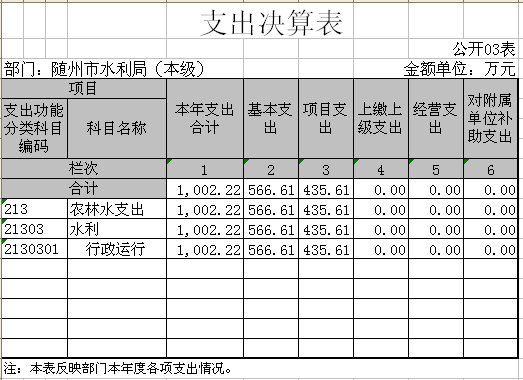 市水利系統(tǒng)納入決算管理的單位共6個(gè),主要包括水利局機(jī)關(guān)、市白云湖水利工程管理局、市水政監(jiān)察支隊(duì)、市水利科學(xué)技術(shù)推廣中心、市河道堤防建設(shè)管理局、市隨中灌區(qū)管理局。市水利局機(jī)關(guān)內(nèi)設(shè)機(jī)構(gòu)八科一室,機(jī)關(guān)行政編制23名,另核定機(jī)關(guān) “以錢養(yǎng)事”崗位3個(gè)。年末實(shí)有在職行政公務(wù)員22人,“以錢養(yǎng)事” 3人,退休9人(含遺屬1人),另有掛職鍛煉及臨時(shí)工作人員12名。