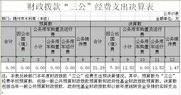 隨州市水利局(本級(jí))2017年財(cái)政撥款“三公”經(jīng)費(fèi)支出21.29萬(wàn)元,比年初預(yù)算19.47萬(wàn)元增加2.02萬(wàn)元,增加10.48%,比上年增加5.92萬(wàn)元。其中: