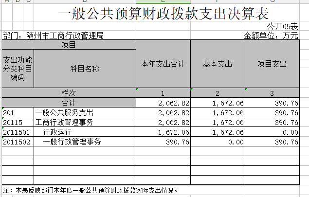 隨州市工商局2017年預算總收入2205.83萬元,其中: 公共財政預算財政撥款1962.32萬元,占88.96%;其他收入112.31萬元,占5.1%;上年結轉131.2萬元,占5.95%。