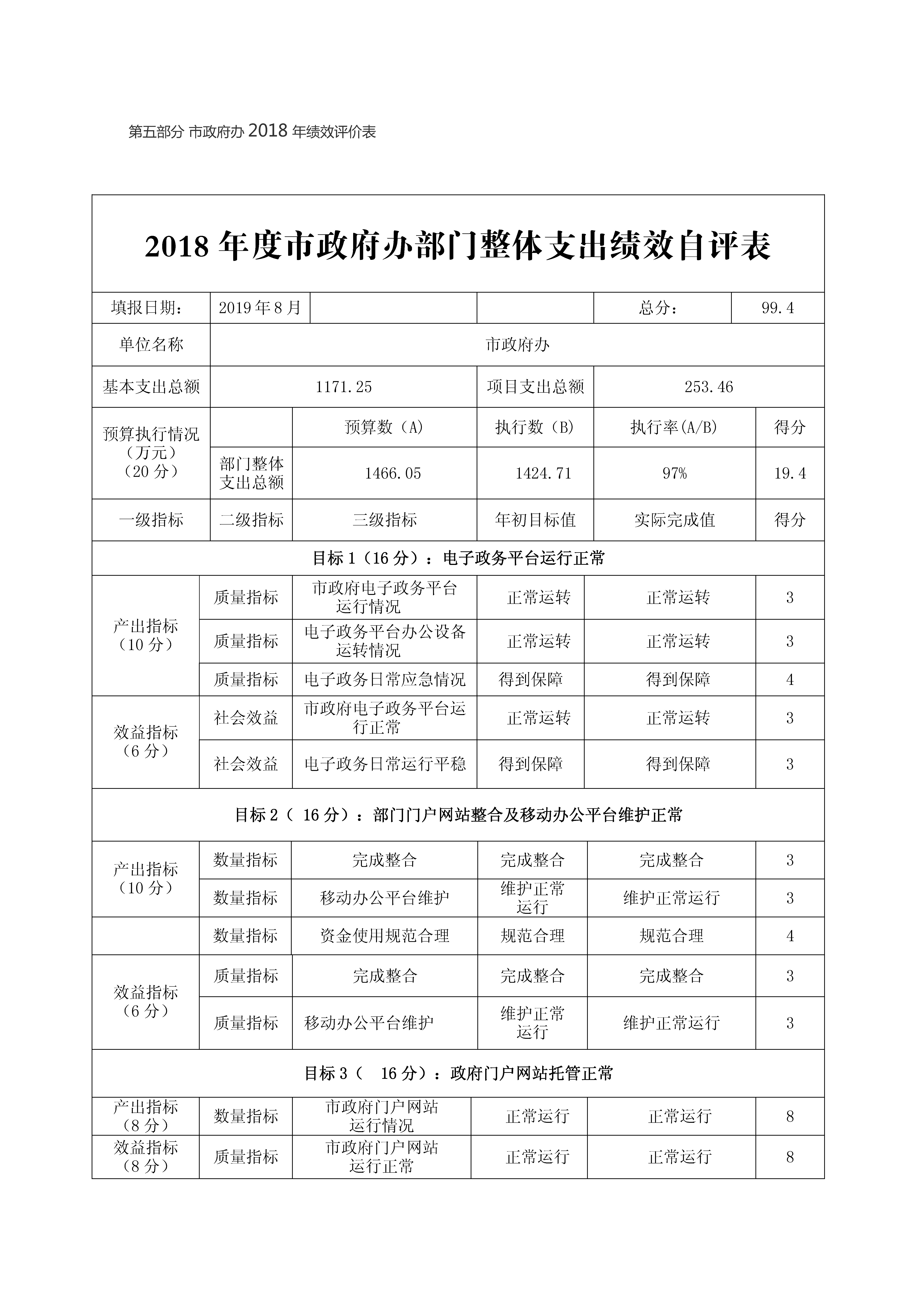 1) 組織開(kāi)展部門(mén)整體支出績(jī)效評(píng)價(jià)情況。市政府辦對(duì)2018年度一般公共預(yù)算組織開(kāi)展部門(mén)整體支出績(jī)效評(píng)價(jià),根據(jù)《2018年市直部門(mén)整體支出績(jī)效自評(píng)表》中績(jī)效指標(biāo)開(kāi)展細(xì)化評(píng)分,2018年市政府辦部門(mén)整體支出績(jī)效自評(píng)得99.4分,績(jī)效等級(jí)為優(yōu)。