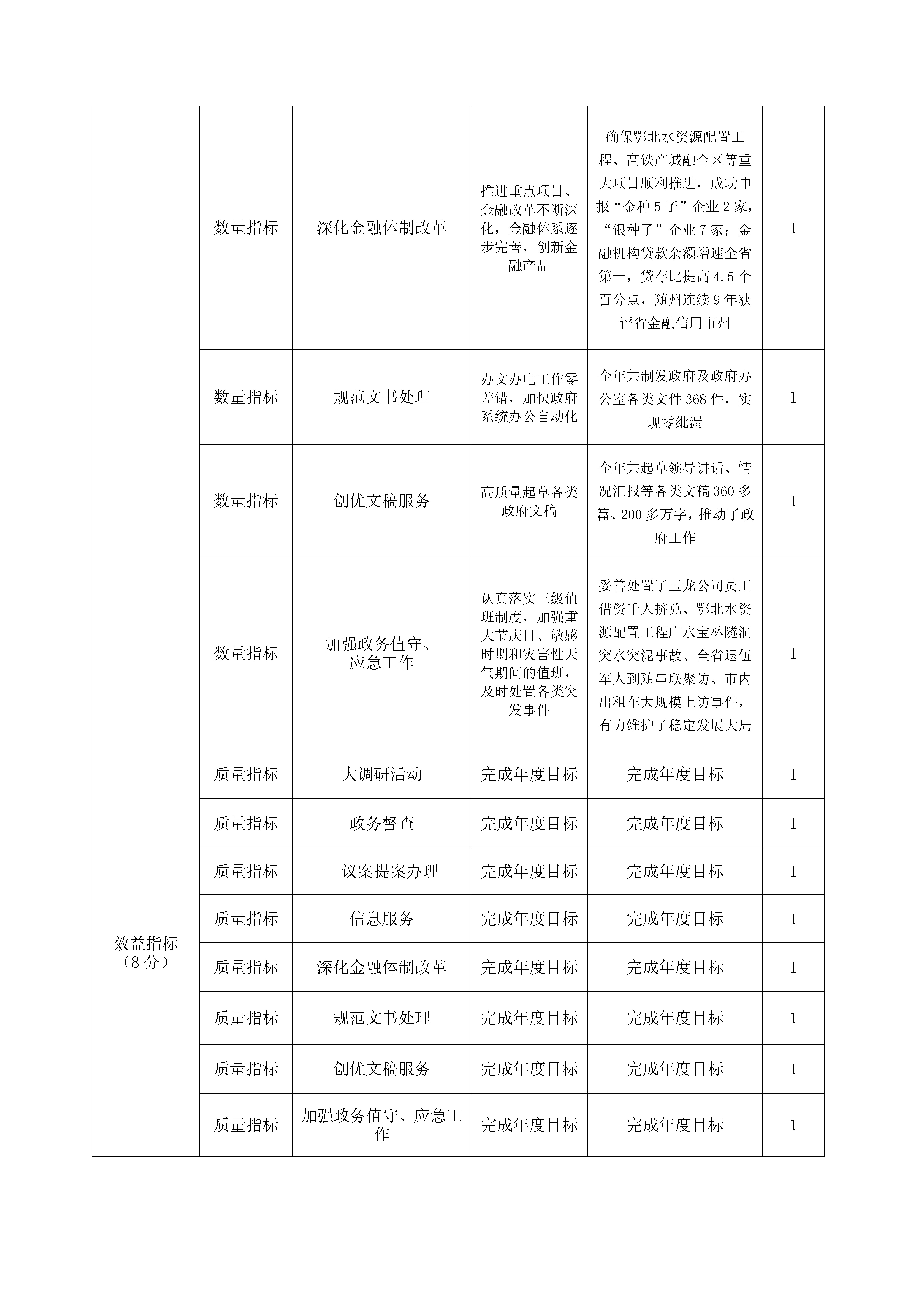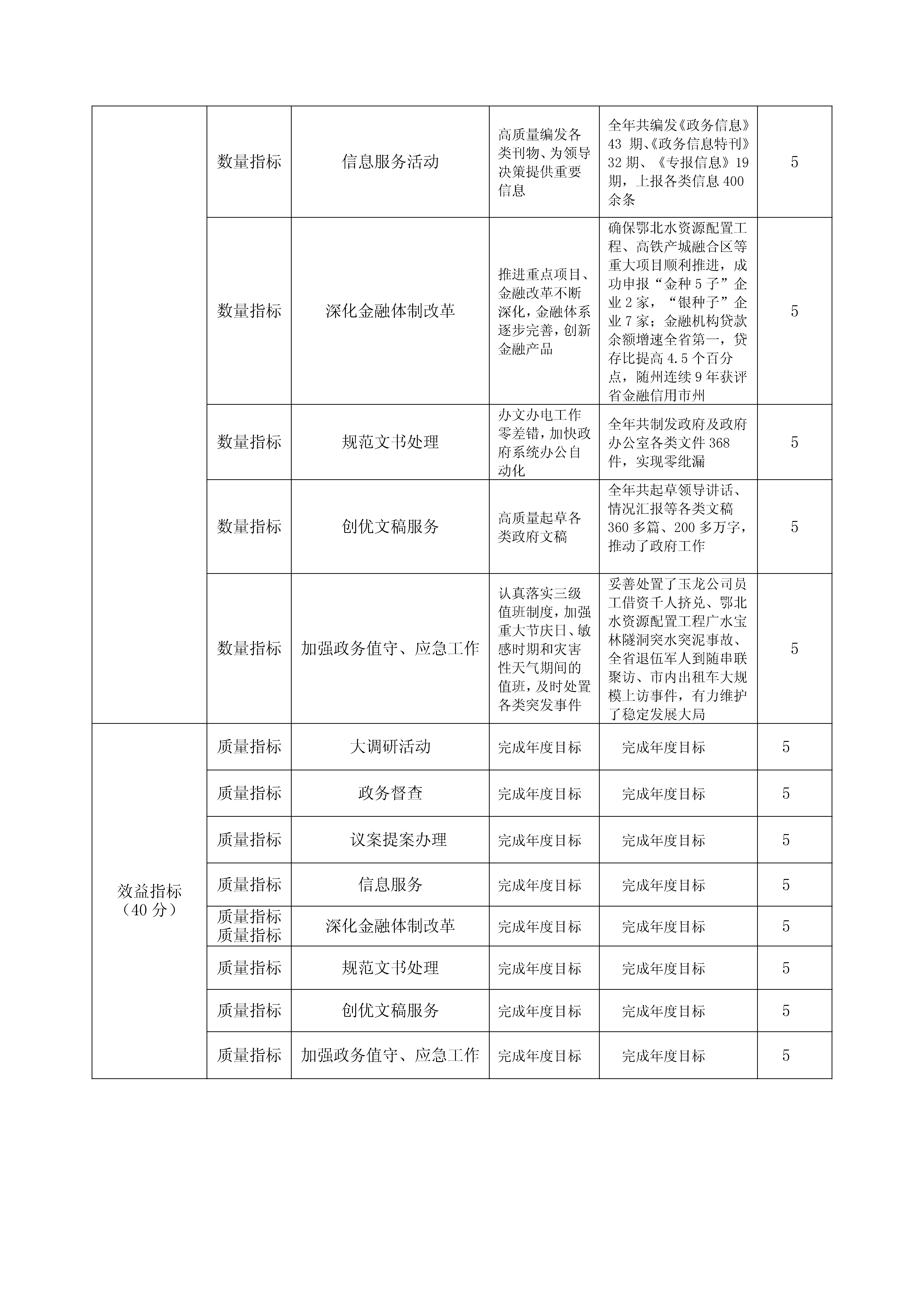 (3)產(chǎn)出指標(biāo)完成情況。主要從深化政務(wù)調(diào)研、強(qiáng)化政務(wù)督查、優(yōu)化信息化服務(wù)、規(guī)范文書(shū)處理、深化金融體制改革、加強(qiáng)政務(wù)值守、加強(qiáng)應(yīng)急管理、做好會(huì)務(wù)服務(wù)、防范和處置非法集資、保障電子政務(wù)平臺(tái)正常運(yùn)行、保障內(nèi)網(wǎng)及移動(dòng)辦公系統(tǒng)正常運(yùn)行等方面進(jìn)行評(píng)價(jià),所設(shè)目標(biāo)指標(biāo)基本完成年初設(shè)定的績(jī)效目標(biāo)。