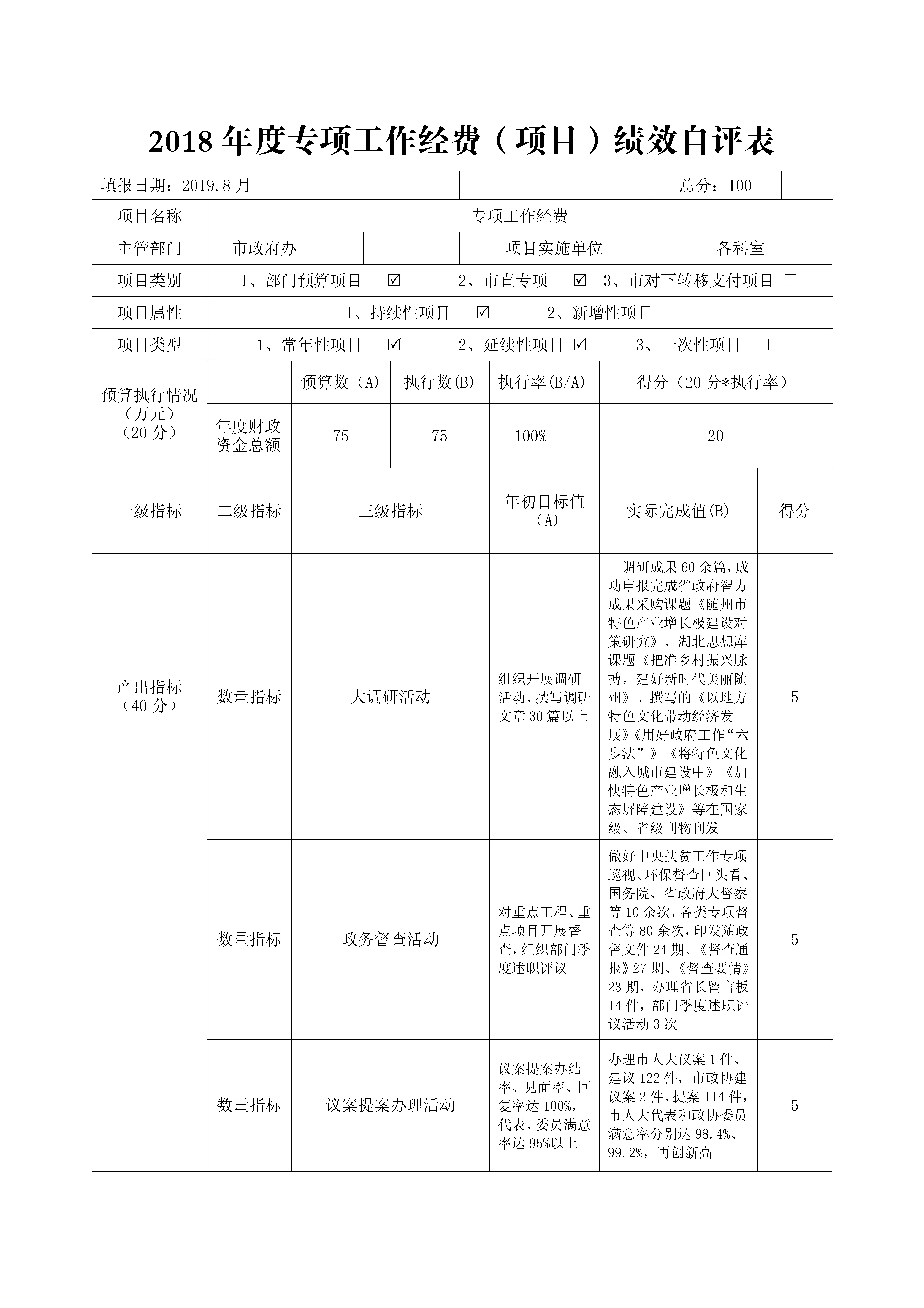 主要產(chǎn)出和效益:1、“大調(diào)研”活動(dòng)成果豐碩。調(diào)研成果60余篇,成功申報(bào)完成省政府智力成果采購(gòu)課題《隨州市特色產(chǎn)業(yè)增長(zhǎng)極建設(shè)對(duì)策研究》、湖北思想庫(kù)課題《把準(zhǔn)鄉(xiāng)村振興脈搏,建好新時(shí)代美麗隨州》。撰寫(xiě)的《以地方特色文化帶動(dòng)經(jīng)濟(jì)發(fā)展》《用好政府工作“六步法”》《將特色文化融入城市建設(shè)中》《加快特色產(chǎn)業(yè)增長(zhǎng)極和生態(tài)屏障建設(shè)》等在國(guó)家級(jí)、省級(jí)刊物刊發(fā)。2、政務(wù)信息服務(wù)全面。全年共編發(fā)《政務(wù)信息》43 期、《政務(wù)信息特刊》32期、《專報(bào)信息》19期,上報(bào)各類信息400余條,信息工作繼續(xù)保持全省市州先進(jìn)行列。3、公文制發(fā)規(guī)范高效。全年共制發(fā)政府及政府辦公室各類文件368件,均做到了政策把握準(zhǔn)確、文字邏輯嚴(yán)密、文件格式規(guī)范,實(shí)現(xiàn)零紕漏。4、文稿服務(wù)量多質(zhì)優(yōu)。全年共起草領(lǐng)導(dǎo)講話、情況匯報(bào)等各類文稿360多篇、200多萬(wàn)字,推動(dòng)了政府工作。5、督辦督查工作到位。加強(qiáng)對(duì)政府常務(wù)會(huì)議、專題會(huì)議等議定事項(xiàng)的檢查督辦,配合做好中央扶貧工作專項(xiàng)巡視、環(huán)保督查回頭看、國(guó)務(wù)院、省政府大督察等10余次,各類專項(xiàng)督查等80余次,印發(fā)隨政督文件24期、《督查通報(bào)》27期、《督查要情》23期,辦理省長(zhǎng)留言板14件,部門(mén)季度述職評(píng)議活動(dòng)3次,有力地推動(dòng)了省委省政府和市委市政府重大決策部署落地生效。6、辦理“兩案”滿意率高。辦理市人大議案1件、建議122件,市政協(xié)建議案2件、提案114件,市人大代表和政協(xié)委員滿意率分別達(dá)到98.4%、99.2%,再創(chuàng)新高。7、金融改革服務(wù)到位。加大政銀企合作對(duì)接力度,確保鄂北水資源配置工程、高鐵產(chǎn)城融合區(qū)等重大項(xiàng)目順利推進(jìn),成功申報(bào)“金種5子”企業(yè)2家,“銀種子”企業(yè)7家;金融機(jī)構(gòu)貸款余額增速全省第一,貸存比提高4.5個(gè)百分點(diǎn),隨州連續(xù)9年獲評(píng)省金融信用市州。8、應(yīng)急值守嚴(yán)格落實(shí)。抓好各類應(yīng)急預(yù)案的編制和修訂完善工作,認(rèn)真落實(shí)24小時(shí)值班、三級(jí)值班和領(lǐng)導(dǎo)帶班制度。妥善處置了玉龍公司員工借資千人擠兌、鄂北水資源配置工程廣水寶林隧洞突水突泥事故、全省退伍軍人到隨串聯(lián)聚訪、市內(nèi)出租車大規(guī)模上訪事件,有力維護(hù)了穩(wěn)定發(fā)展大局。