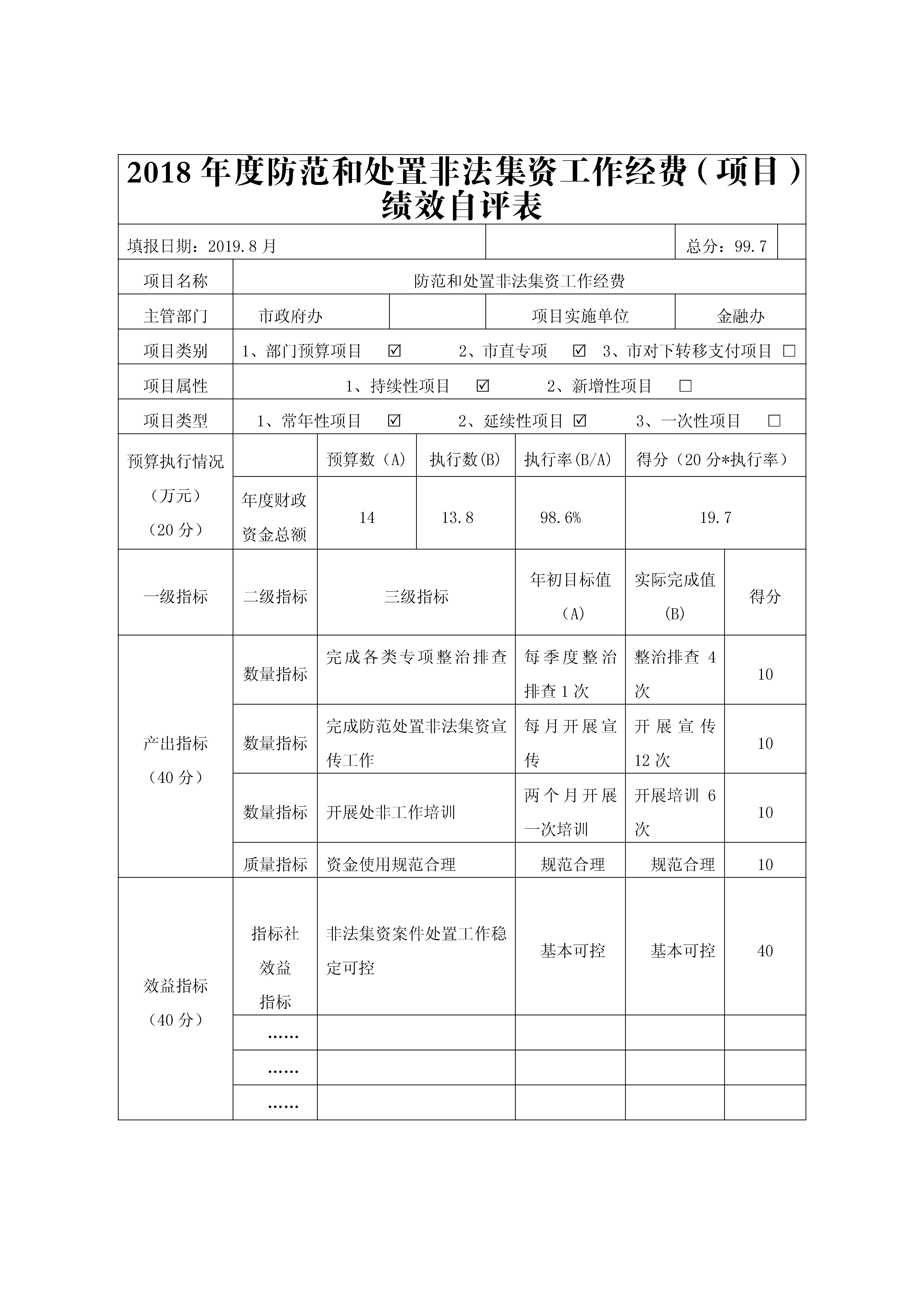 績(jī)效自評(píng)工作開(kāi)展情況:2018年防范和處置非法集資專項(xiàng)工作經(jīng)費(fèi),前期論證資金設(shè)立符合有關(guān)規(guī)定,資金投向和結(jié)構(gòu)相對(duì)合理,且符合相關(guān)管理辦法。組織過(guò)程中,按規(guī)定實(shí)施,各類宣傳、培訓(xùn)、排查及有關(guān)案件處置均有實(shí)施方案并履行報(bào)批手續(xù)。