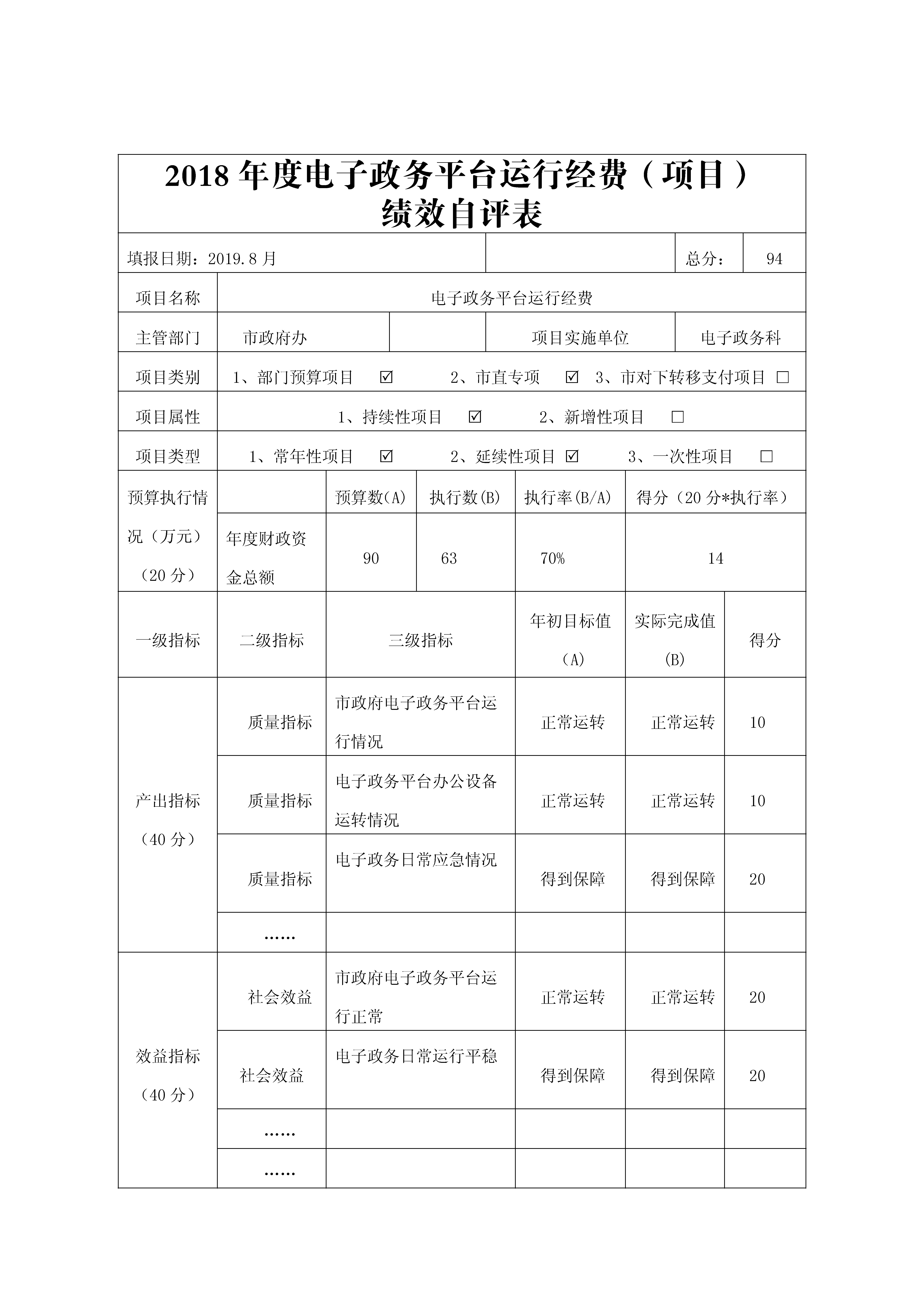 績(jī)效自評(píng)工作開(kāi)展情況:市政府電子政務(wù)平臺(tái)維保經(jīng)費(fèi)、購(gòu)置電子政務(wù)外網(wǎng)專用辦公設(shè)備和電子政務(wù)日常應(yīng)急費(fèi)用等主要用于保障市政府電子政務(wù)平臺(tái)的正常運(yùn)轉(zhuǎn)使用及相關(guān)專項(xiàng)支出,資金及時(shí)到位,執(zhí)行科學(xué)規(guī)范。