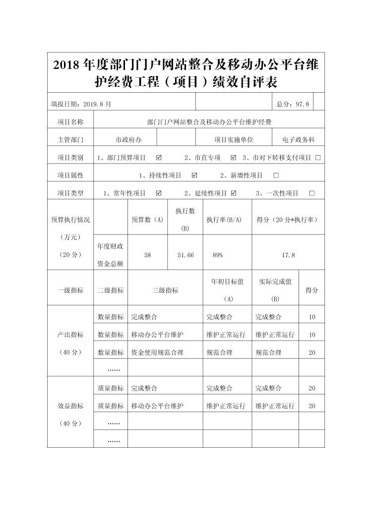 綜合評(píng)價(jià)結(jié)論:部門(mén)門(mén)戶網(wǎng)站整合及移動(dòng)辦公平臺(tái)維護(hù)運(yùn)行正常,經(jīng)費(fèi)得到有力保障。