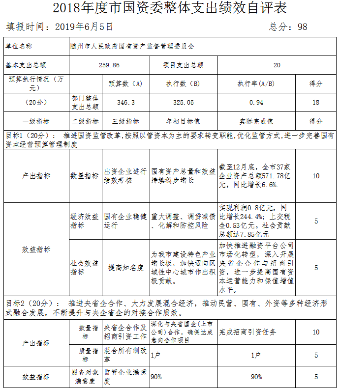 ??對照年初的目標任務和考核要求,我委堅持實事求是的原則,以績效考核的各項文件精神為指導,以整體績效支出為內容,對2018年度各項支出的質量指標,數量指標等內容進行了自評,自評得分98分,績效等級為優。
