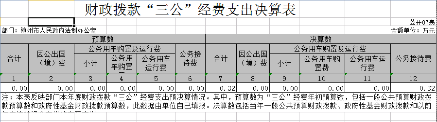 隨州市政府法制辦2018年度“三公”經費總支出0.32萬元,比上年度減少0.81萬元,“三公”經費開支具體明細如下:(1)公務用車運行費0萬元。主要是法制辦沒有公車,原有的兩輛公務用車全部移交政府公車平臺。(2)公務接待費0.32萬元。(國內公務接待6批次46人次,無外事接待),經費開支控制在年初預算范圍內,公務接待費比上年度減少0.81萬元,主要是2018年度市法制辦進一步嚴格了公務活動接待。(3)2018年無因公出國(境)支出。
