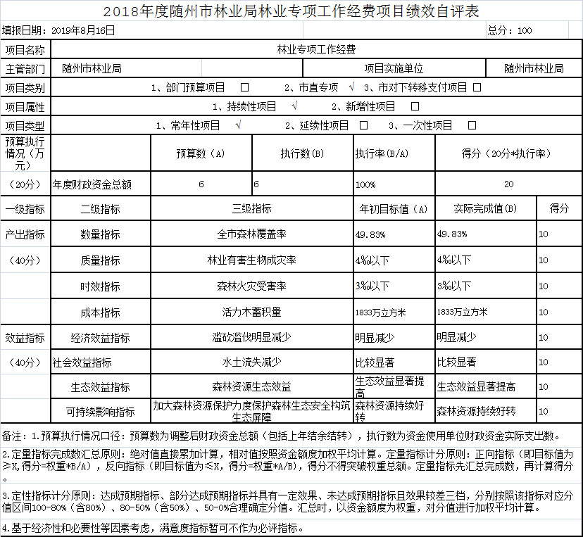 根據《市財政局關于2018年開展財政支出績效評價工作的通知》(隨財發〔2019〕9號)文件精神,我單位從任務完成、實施措施、資金管理及使用、項目效益等方面開展了2018年度林業專項工作經費支出項目績效自評工作。