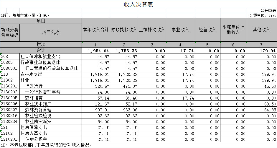 1、市直林業部門。2018年收入1984.04萬元,其中財政撥款1786.36萬元,事業收入17.74萬元,其他收入179.94萬。上年部門總收入2052.35萬元,比上年減少68.31萬元,主要原因是財政撥款減少。