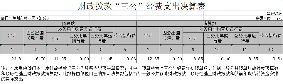 2018年保有公務車7輛(行政單位4輛,事業單位3輛),國有大洪山林場購買運兵車一輛,用的是省撥專款。公務車運行費8.85萬元,比2017年15.95萬元減少7.1萬元,降低44.51%,主要原因為進一步加強公務用車管理,運行成本和運行費用下降。
