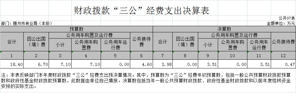 2、市林業局。2018年“三公”支出合計3.98萬元,是年初預算18.4萬元的21.63%,2017年“三公”支出7.86萬元,2018年“三公”較上年支出減少3.88萬元,下降49.36%,“三公”經費呈下降趨勢,主要原因隨州市林業局落實中央八項規定,從嚴從緊“三公”支出。