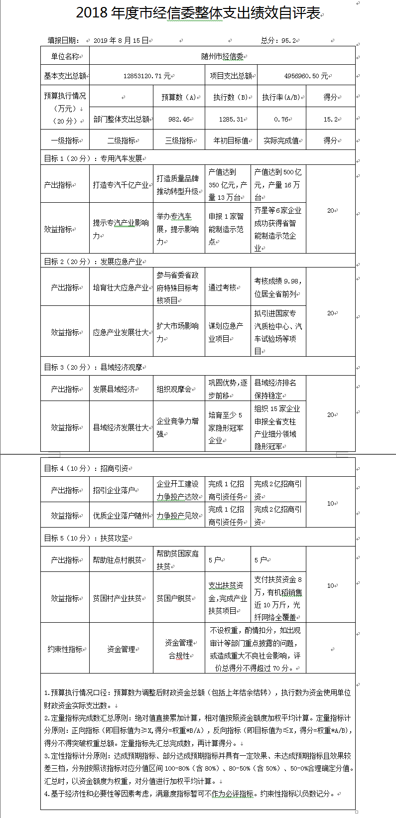 對(duì)照年初的目標(biāo)任務(wù)和考核要求,我委堅(jiān)持實(shí)事求是的原則,以績(jī)效考核的各項(xiàng)文件精神為指導(dǎo),以整體績(jī)效支出為內(nèi)容,對(duì)各項(xiàng)支出的質(zhì)量指標(biāo),數(shù)量指標(biāo)等內(nèi)容進(jìn)行了自評(píng),自評(píng)得分95.2分,達(dá)成預(yù)期指標(biāo)。目標(biāo)完成情況如下: