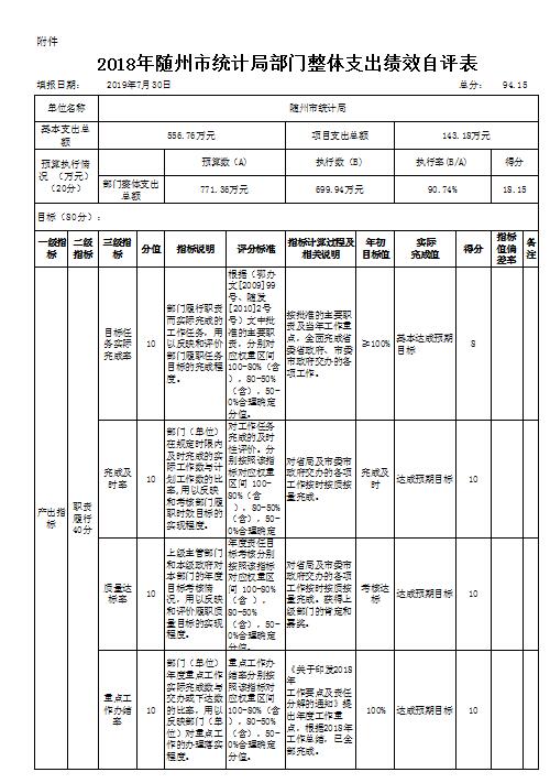 根據《2018年市統計局整體支出績效自評表》中績效指標分析評分,隨州市統計局2018年部門整體支出績效自評得分94.15分,績效評價等級為優。