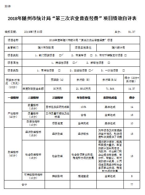 根據《2018年市統計局“第三次農業普查經費”項目績效自評表》中績效指標分析評分,隨州市統計局2018年度“第三次農業普查經費”項目績效自評得分91.37分,績效評價等級為優。