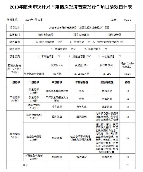 根據《2018年市統計局“第四次經濟普查經費”項目績效自評表》中績效指標分析評分,隨州市統計局2018年度“第四次經濟普查經費”項目績效自評得分92.24分,績效評價等級為優。