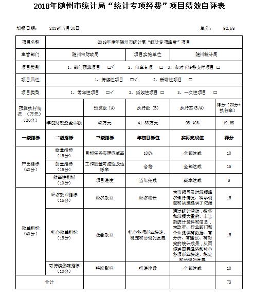 根據《2018年市統計局“統計專項經費”項目績效自評表》中績效指標分析評分,隨州市統計局2018年度“統計專項經費”項目績效自評得分92.68分,績效評價等級為優。