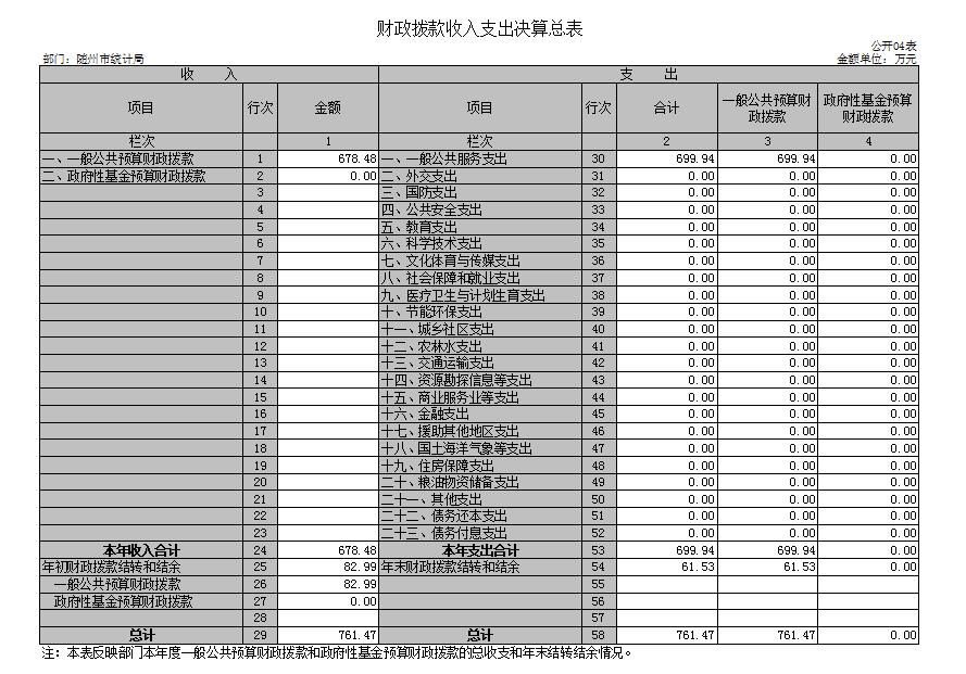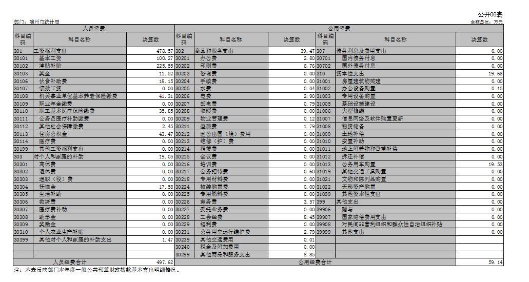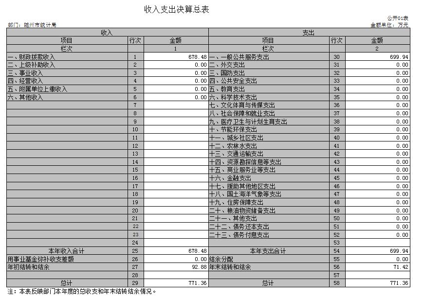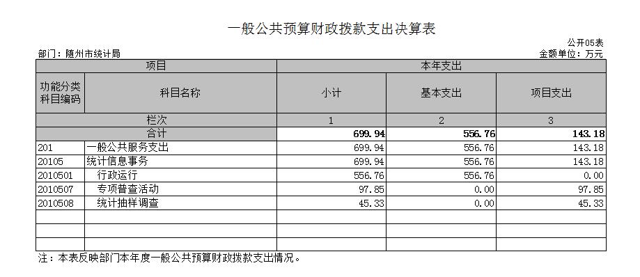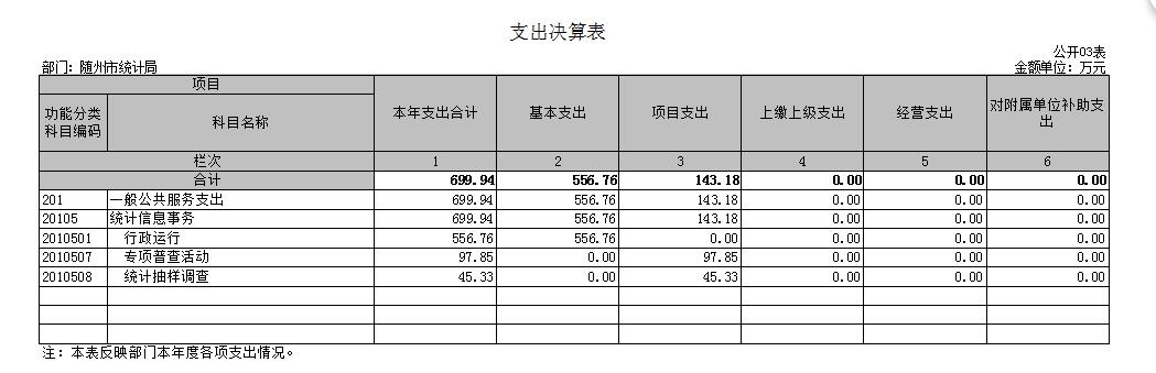 2018年支出771.36萬元,比上年704.24萬元增加9.53%。其中本年支出699.94萬元(其中一般公共服務支出699.94萬元),比上年611.36增加14.49%;年末結轉和結余71.42萬元,比上年92.88萬元減少23.11%。支出增加原因是開展隨州全國第四次經濟普查項目。