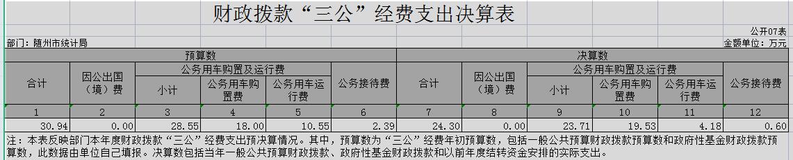 市統計局2018年財政撥款機關運行經費59.14萬元,比上年33.87萬元增加74.6%。其中辦公費2.80萬元,比上年1.77萬元增加58.19% ;水電費2.94萬元,上年0元;郵電費0.79萬元,比上年0.29萬元增加172.41%;物業管理費0.12,上年0元;差旅費1.80萬元,比上年0.08萬元增加2150%;會議費0萬元,比上年0.11萬元減少100%;公務接待費0.6萬元,比上年0.98萬元減少38.78%;勞務費3.57萬元,比上年3.74萬元減少4.55%;公務用車運行維護費2.79萬元,比上年0.95萬元增加193.68%;其他交通費用0.0075萬元,比上年20.96萬元減少99.96%;其他商品和服務支出8.85萬元,比上年2.77萬元增加219.49%;辦公設備購置0.15萬元,比上年2.22萬元減少93.24%,公務用車購置19.53萬元,去年0元。增減原因:厲行節約,嚴格管理,大幅縮減了各項運行經費開支,公務交通補貼不再計算在其他交通費用中,計算在人員經費開支中,2018年新購置了公務用車,開展隨州市全國第四次經濟普查相關辦公費、差旅費、公務用車費增加;職工工作餐開支計算在其他商品和服務支出。