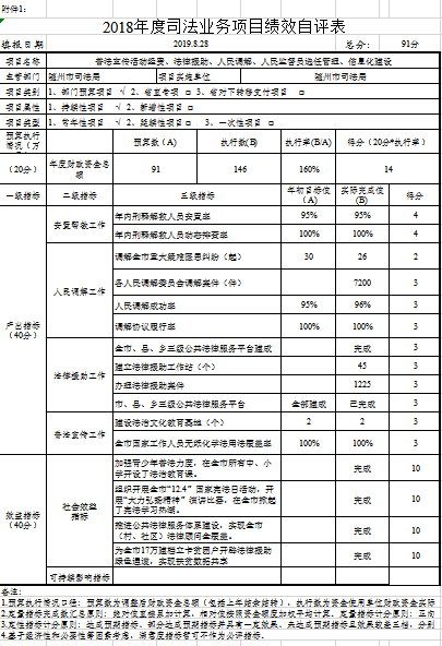 (二)、人民調(diào)解項目績效自評綜述:1.項目資金到位情況分析:該項目資金2018年預(yù)算金額5萬元,實際預(yù)算下達5萬。該項目資金實際執(zhí)行4.97萬元,資金執(zhí)行率99.4%。