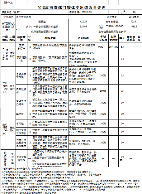 本次績效評價是按照財政部制定的《預(yù)算績效評價共性指標(biāo)體系框架》中的《部門整體支出績效評價共性指標(biāo)體系框架》評價標(biāo)準(zhǔn),并考慮我單位的工作職能和特點,對本單位2018年度部門整體支出進行績效評價,經(jīng)自評,2018年度本單位整體支出績效評價綜合得分85分,預(yù)算執(zhí)行率167.14%。