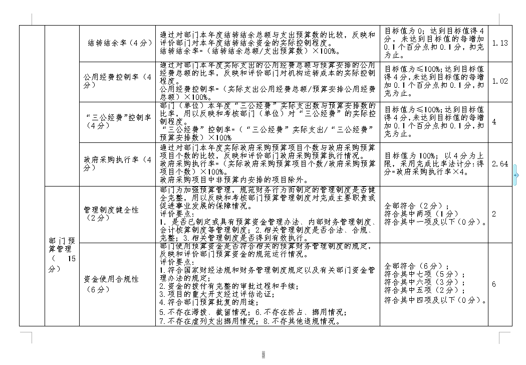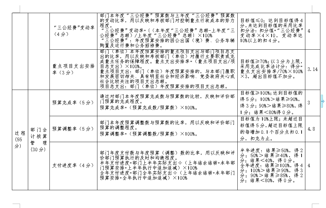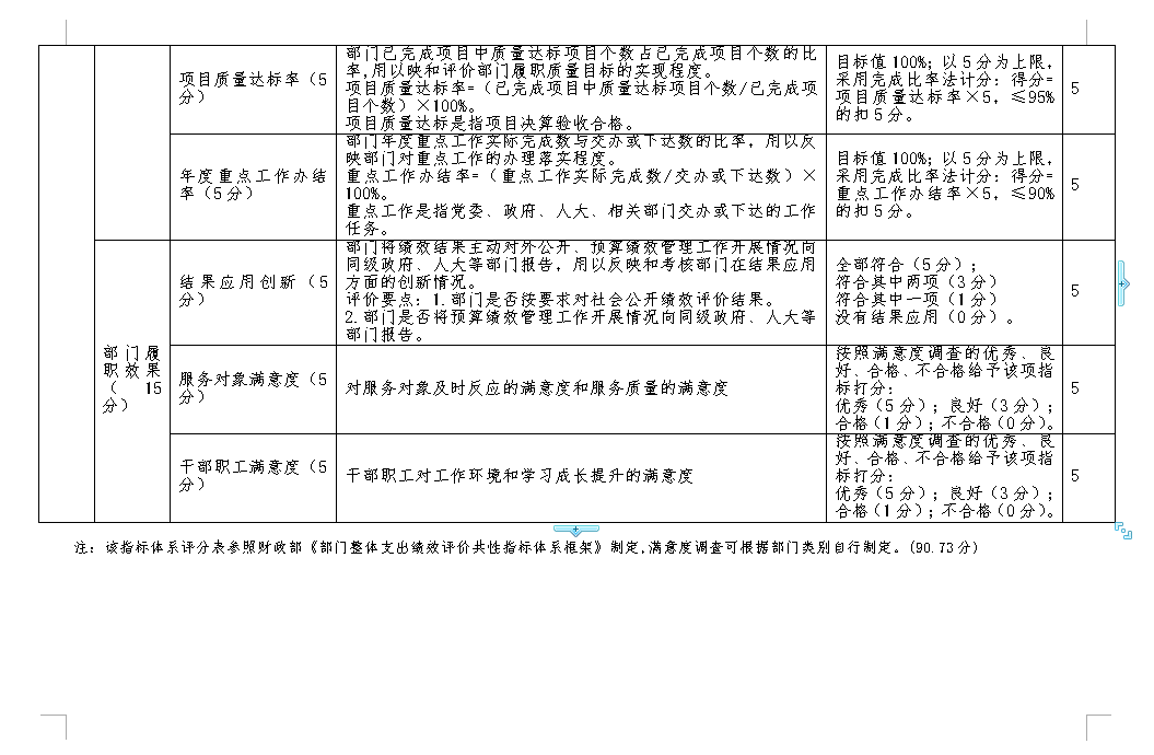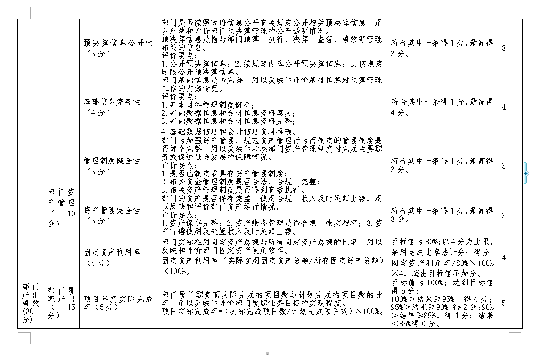 | 項目??績效??(60分) ?? | 項目??產(chǎn)出?????? (30分) ?? | 預(yù)算控制(6分) ?? | 項目施工單位是否按照預(yù)算計劃全部完成。用以反映和評價項目的完成程度。 ?? | 預(yù)算執(zhí)行率超過90%計5分,每降低10%,扣2分,扣完為止 ?? | 6 |