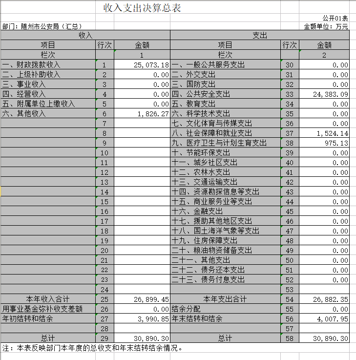 ??2018年隨州市公安局匯總決算收入30890.3萬元,比預(yù)算收入增加3016.6萬元,增加10.82%。其中財政撥款收入25073.18萬元,比預(yù)算收入增加2718.09萬元,增加12.16%,主要是增加獎勵工資;其他收入1826.27萬元,比預(yù)算收入增加484.71萬元,增加36.13%,主要是市紀委撥看守所留置專區(qū)建設(shè)經(jīng)費,市城投撥交警支隊交通設(shè)施建設(shè)費,曾都區(qū)財政增加輔警人員經(jīng)費及平安城市建設(shè)經(jīng)費;結(jié)余資金3990.85萬元,比預(yù)算收入減少186.2萬元,預(yù)算數(shù)為預(yù)估。