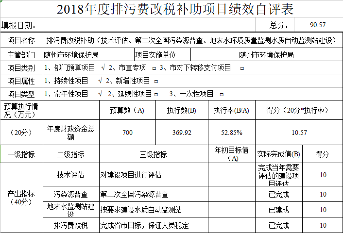 ②排污費改稅補助(技術評估、第二次全國污染源普查、地表水環境質量監測水質自動監測站建設)項目績效自評:項目全年預算數為700萬元,完成預算369.92萬元,執行率52.85%。主要產出和效果:一是按《建設項目環境影響評價分類管理名錄》,堅持節約開支與科學管理相結合,對環境影響大、風險高的新、改、擴建建設項目,都組織開展了專家技術評審,實現了應評盡評;二是對全國第二次污染源普查工作開展進行了保障;三是按要求完成地表水環境質量監測水質自動監測站建設項目。