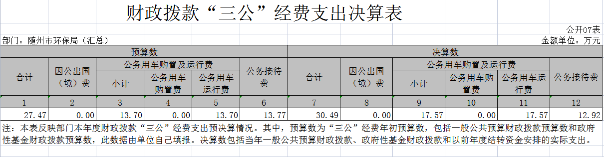 2018年局系統匯總“三公”經費決算支出總計30.49萬元,其中公務用車運行維護費17.57萬元,公務接待費12.92萬元,國內公務接待132批次,1619多人次(省環保督察進駐20天);因公出國費0萬元;公務用車購置數為0,公務用車保有量9輛;較上年增加15.89萬元,增幅108.84%。主要原因是相關環保督察、檢查任務加重;