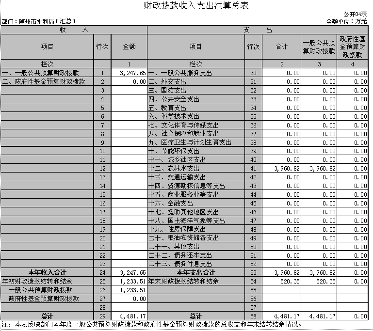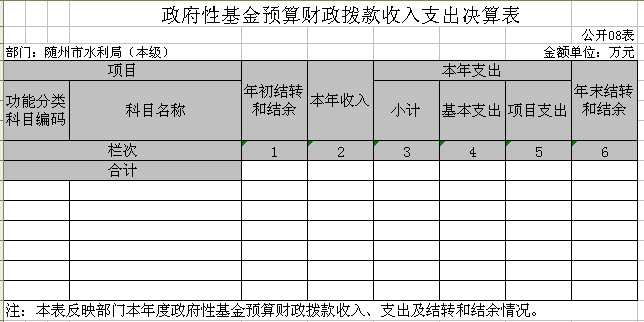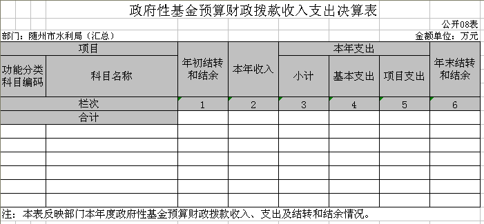 隨州市水利局(匯總)無政府性基金預算。隨州市水利局(本級)無政府性基金預算。年初預算無政府性基金收入,上年決算也無政府性基金收入。