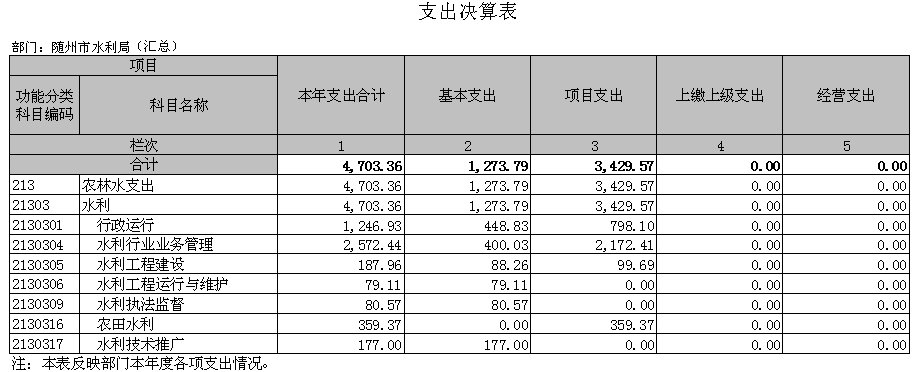 隨州市水利局(匯總)2018年決算支出總計6421.85萬元,其中:基本支出1273.79萬元,項目支出3429.57萬元,年末結轉和結余1718.49萬元。