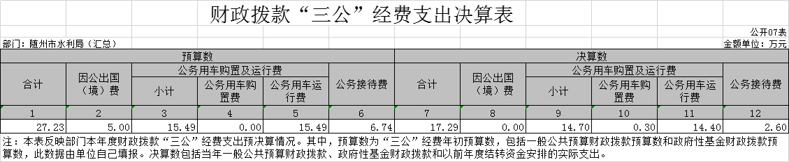 (3)2018公務用車2輛運行維護費12.54萬元,比年初預算15.49萬元減少2.95萬元,減少19%,比上年12.52萬元差不多。主要原因是嚴格執行公車管理相關制度,公車運行維護費用開支減少;。隨州市水利局(本級)共有公務車輛2輛,其中:一般公務用車2輛。無公務用車購置費。