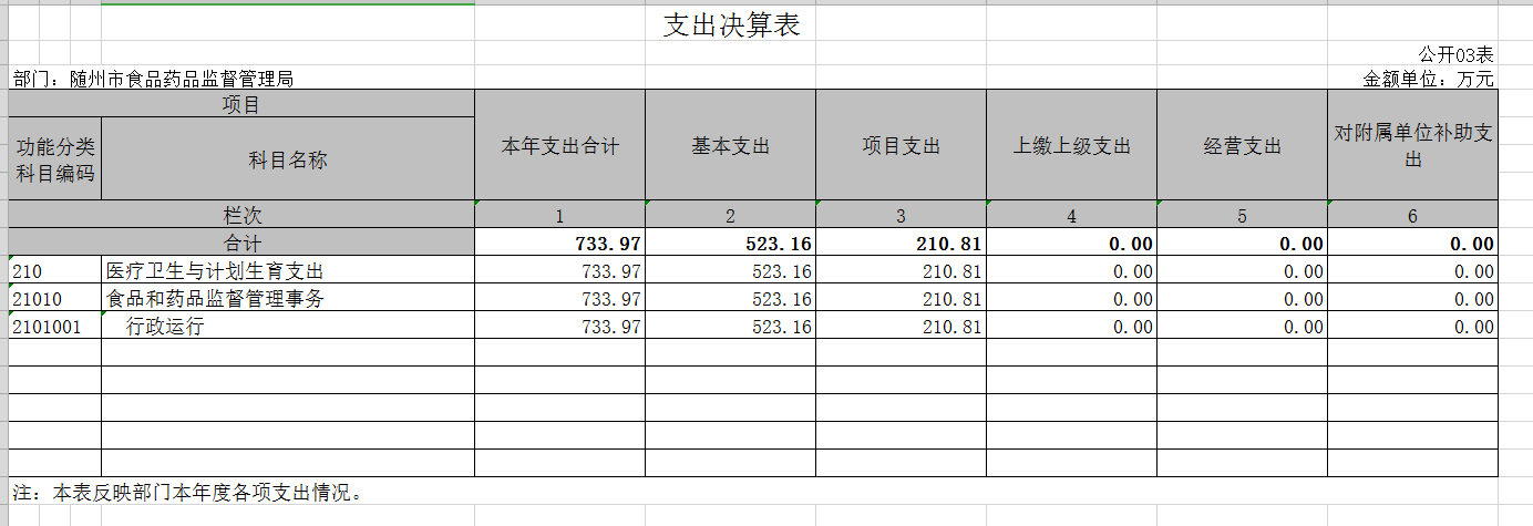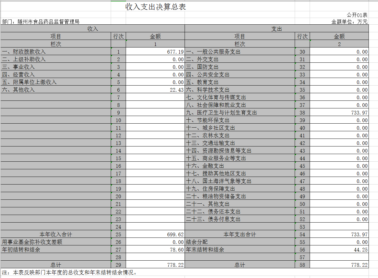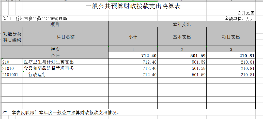 2018年,隨州市食品藥品監督管理局在省食藥監局及市委、市政府的堅強領導下,在全體干部職工的共同努力下,緊緊圍繞中心工作及重點工作,優作風、創亮點、重實干、善創新,較好地完成了年度各項工作任務。一是對深入推進食品放心工程建設,全力保障居民飲食用藥安全做出了積極的貢獻。二是優化行政審批,打造高效便民審批體系。三是扎實推進監管工作,取得顯著成效。四是鼓勵社會監督,引導社會各界廣泛有序參與。三、有關科目名稱解釋