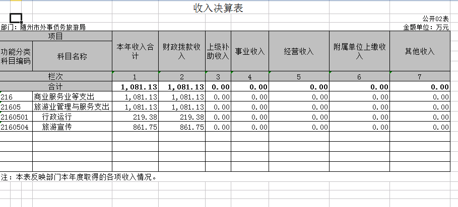 本年度決算收入總計(jì)1081.13萬元,減少的原因是:自2018年7月份退休人員退休金由人社部門直接支付;旅游業(yè)管理與服務(wù)支出1081.13萬元(行政運(yùn)行219.38萬元較2017年363.3萬元減少143.92萬元;旅游宣傳861.75萬元較2017年1466.95萬元減少605.2萬元,減少41.26%),較2017年1830.25萬元減少749.12萬元,減少40.93%,主要原因市財(cái)政經(jīng)費(fèi)預(yù)算減少。