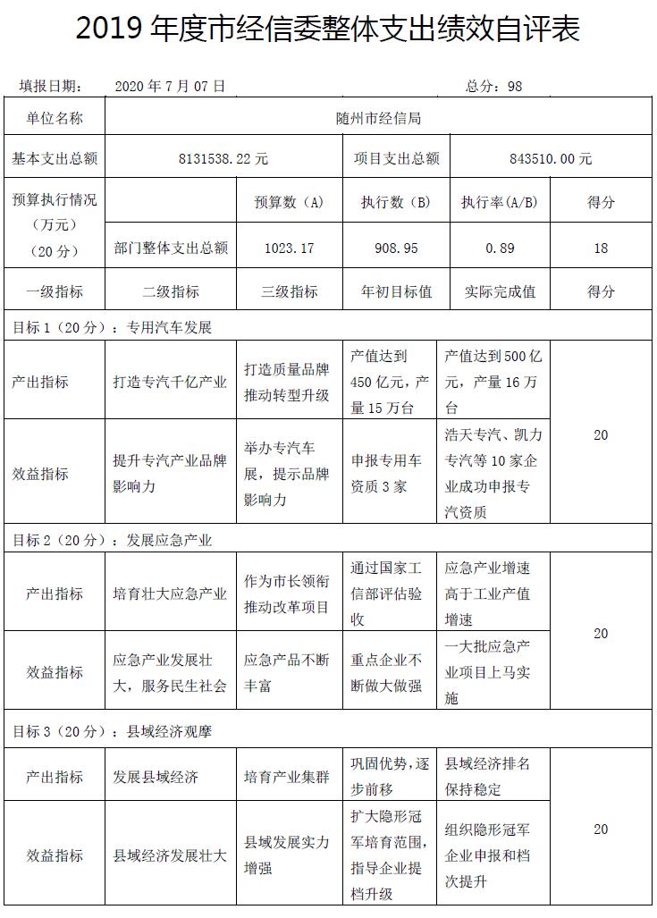 對(duì)照年初的目標(biāo)任務(wù)和考核要求,我局堅(jiān)持實(shí)事求是的原則,以績(jī)效考核的各項(xiàng)文件精神為指導(dǎo),以整體績(jī)效支出為內(nèi)容,對(duì)各項(xiàng)支出的質(zhì)量指標(biāo),數(shù)量指標(biāo)等內(nèi)容進(jìn)行了自評(píng),自評(píng)得分98分,達(dá)成預(yù)期指標(biāo)。目標(biāo)完成情況如下: