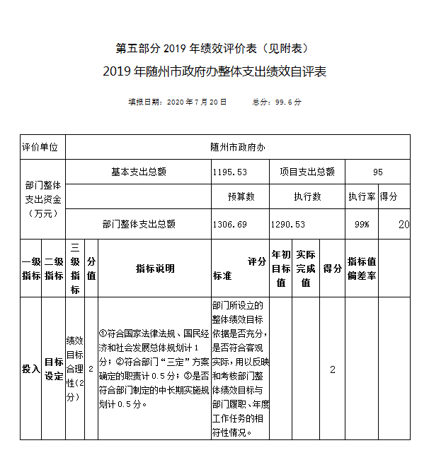 (1)組織開展部門整體支出績效評價情況。市政府辦對2019年度一般公共預算組織開展部門整體支出績效評價,根據《2019年市直部門整體支出績效自評表》中績效指標開展細化評分,2019年市政府辦部門整體支出績效自評得99.6分,績效等級為優。