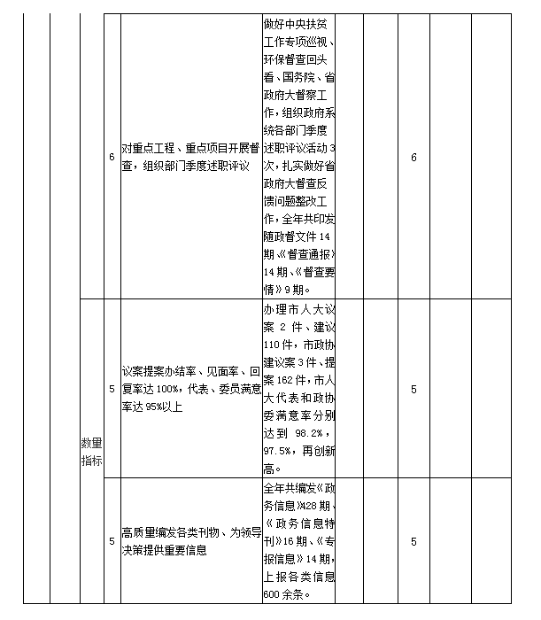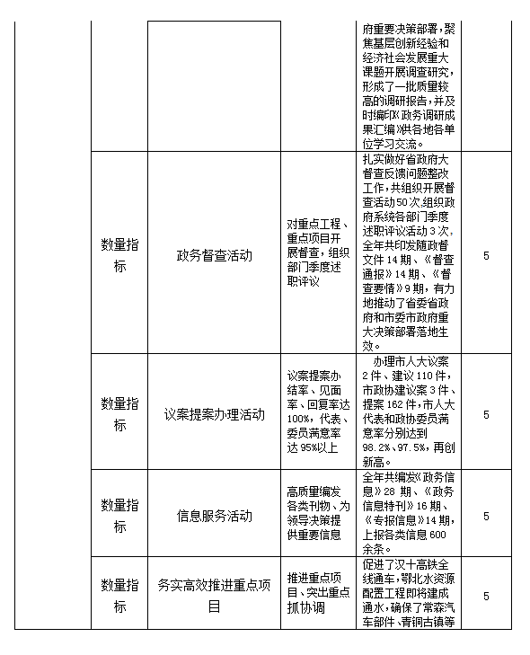 主要產出和效益:1、持續開展政府系統“大調研”活動,緊緊圍繞國家重大發展戰略和市委市政府重要決策部署,聚焦基層創新經驗和經濟社會發展重大課題開展調查研究,形成了一批質量較高的調研報告,并及時編印《政務調研成果匯編》供各地各單位學習交流。2、狠抓信息服務。全年編發本級《政務信息》28期,《政務信息特刊》16期,《專報信息》14期,上報省政府辦公廳信息600多條,其中,被省政府辦公廳采用77條,被國務院辦公廳采用17條,有1條獲國務院領導批示,1條獲省政府領導批示,3條獲市政府領導批示。3、規范文稿制發。全年共制發政府及政府辦公室各類文件204件,均做到了政策把握準確、文字邏輯嚴密、文件格式規范,實現零紕漏。4、創優文稿服務。倡導落實“短、實、新”優良文風,全年共起草領導講話、情況匯報等各類文稿400余篇,較好把握了當前實際,發揮了推進工作、加快發展的積極作用。5、加大督辦力度。突出抓好國務院“六穩”工作部署和省市《政府工作報告》重點工作、省市領導重要批示件的督辦落實,組織政府系統各部門季度述職評議活動3次,開展全市“迎國慶、保軍運”信訪維穩、“四個三重大生態工程”、城市重點工程建設、森林防火等重點督查工作,扎實做好省政府大督查反饋問題整改工作,全年共印發隨政督文件14期、《督查通報》14期、《督查要情》9期,有力地推動了省委省政府和市委市政府重大決策部署落地生效。6、認真辦理“兩案”。辦理市人大議案2件、人大代表建議110件、市政協建議案3件、政協提案162件,積極開展“三見面”、二次辦理、“回頭看”辦理等活動,如期完成辦理任務,市人大代表和政協委員滿意率分別達到98.2%、97.5%再創新高。7、嚴格應急值守。認真落實24小時值班、領導帶班、三級值班制度,加強重大節假日、敏感時期和災害性天氣期間的值班,對緊急信息和重大事項實行限時報告。妥善解決人民群眾實際困難,全年共接待處理到市政府上訪事件200多起,涉及數千人,有力維護了社會大局穩定。綜合評價結論:政務督查、議案提案辦理、總值班室、信息科、政府工作報告起草、離退休干部、政務會務接待、國動辦等專項工作順利有序開展,經費得到有效保障。