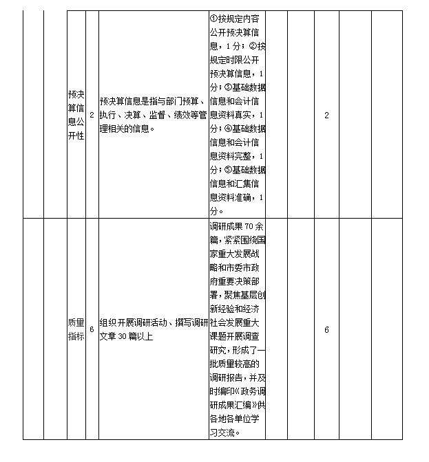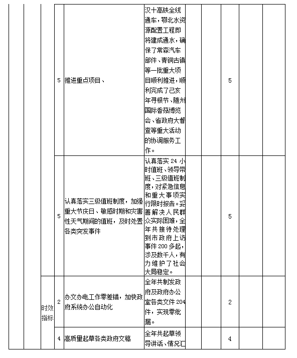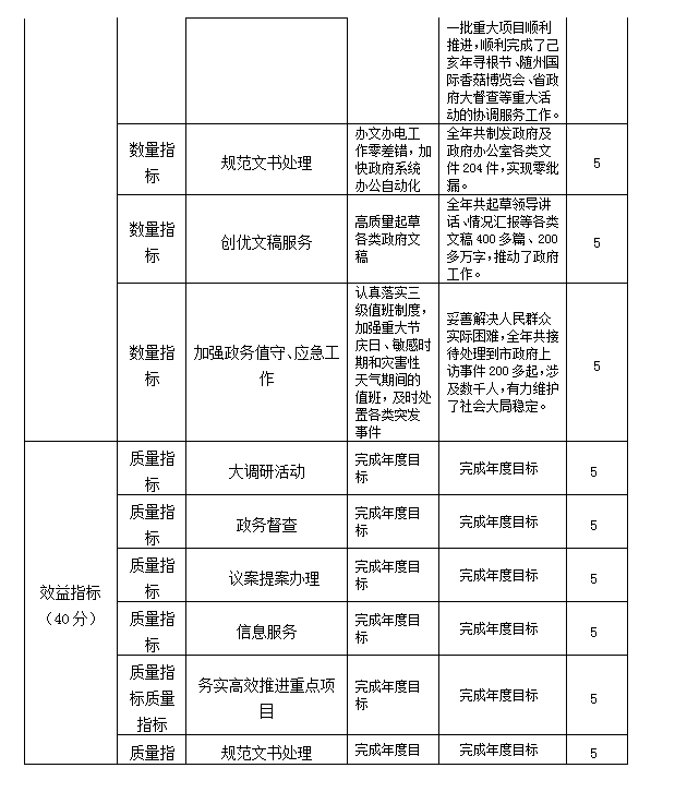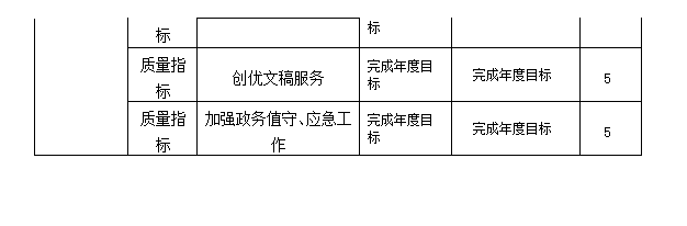 (3)產出指標完成情況。主要從深化政務調研、強化政務督查、優化信息化服務、規范文書處理、加強政務值守、做好會務服務等方面進行評價,所設目標指標基本完成年初設定的績效目標。