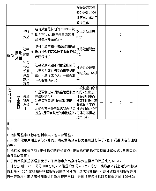 (4)效益指標完成情況。主要對完成政府各項工作情況進行評價,各項工作順利有序開展,經費得到有效保障,基本達到年初設定的績效目標。