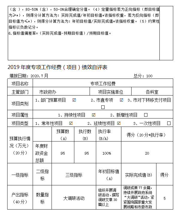 根據預算績效管理要求,市政府辦認真組織對2019年度一般公共預算項目支出全面開展績效自評,共涉及部門預算項目1個,項目預算安排資金合計95萬元,占一般公共預算項目支出總額的100%。從評價情況來看,本單位明確了經費審批權限及程序,經費預算管理、資產購置與處置、財務監督等,進一步落實厲行節約的各項規定,確保各項經費及“三公”經費使用合理合規。