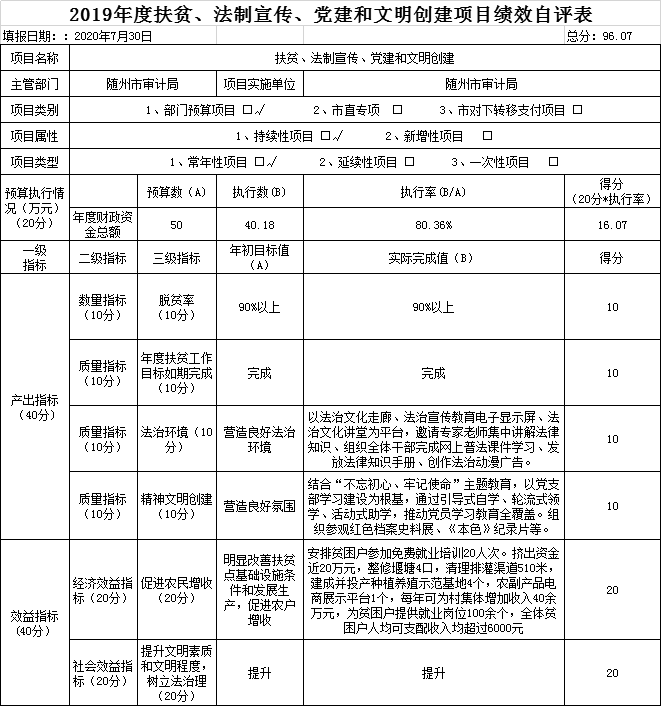 2.扶貧、黨建、法制宣傳和文明創建經費項目績效自評: