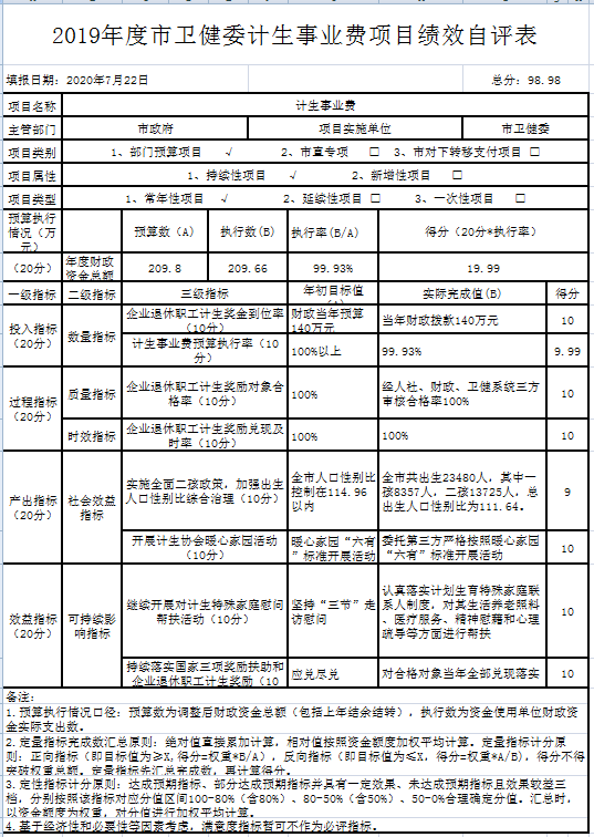 一是計劃生育事業費(常年性項目)。2019年度計生事業費預算情況。預算專項資金209.8萬元,來源主要是當年財政預算撥款140萬元,中央和省級轉移支付15萬元,國家計生協會專項20萬元,上年結轉34.8萬元。項目實施內容為計劃生育事業的利益導向、公共服務、能力建設和管理運行的經費。通過抓項目實施推進計生事業目標實現。2019年度計生事業費資金使用情況。項目支出總額209.66萬元,項目資金執行率為99.93%。本績效評價經財政局委托第三方項目績效評價等級為做優,評價分100分。