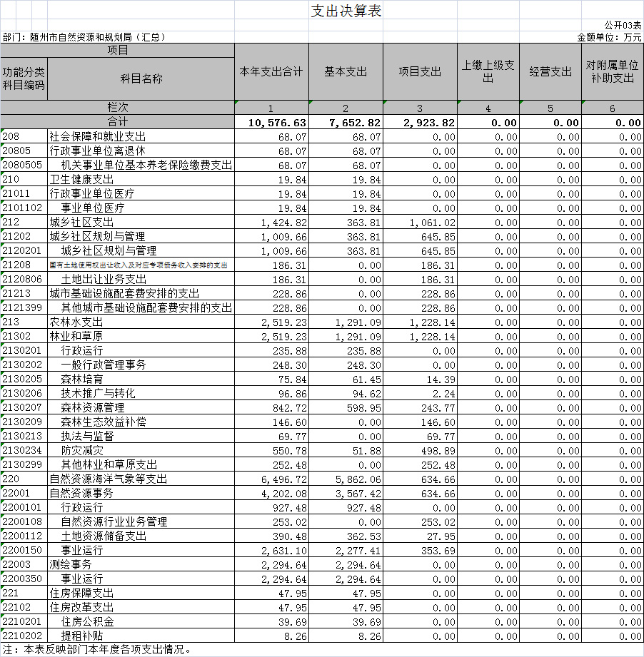 隨州市自然資源和規劃局(匯總)2019年度支出總計10576.63萬元,其中基本支出7652.82萬元、項目支出2923.81萬元。隨州市自然資源和規劃局為2019年4月新組建單位,納入部門決算管理的單位共19個,無上年對比數據。